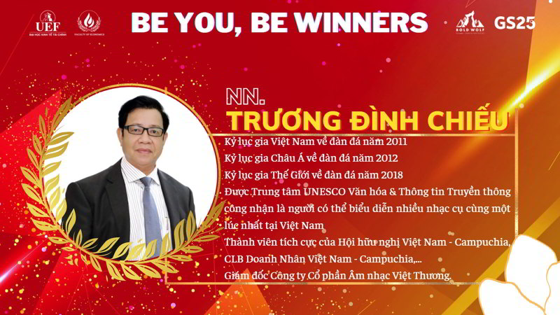 Góp phần giúp không khí buổi chào đón tân sinh viên thêm ấn tượng, Kỷ lục gia Trương Đình Chiếu cũng đã gửi tặng các bạn tiết mục chơi nhạc cụ độc đáo - những điều làm nên tên tuổi của ông.