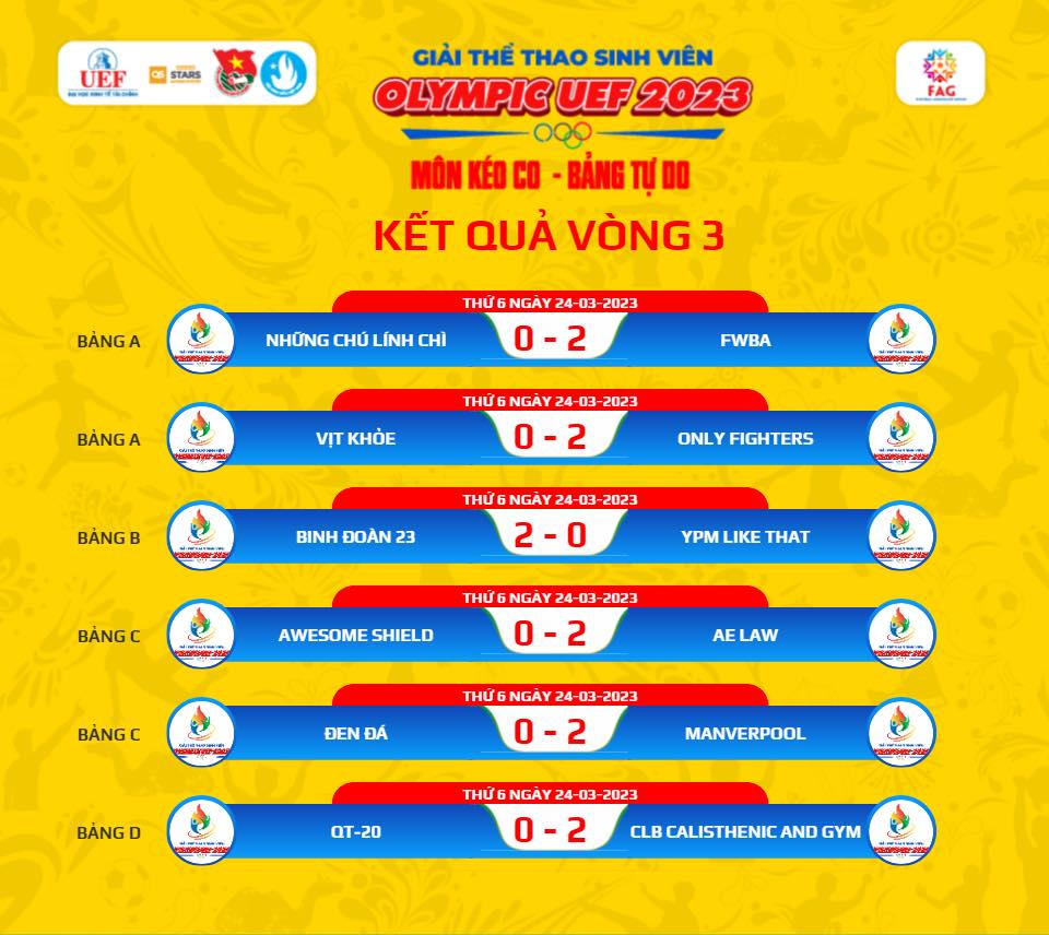 Vòng thi nổi bật với sự lội ngược dòng của CLB Calisthenic and Gym tại bảng D với chiến thắng 2 - 0 trước đội QT-20. Kết quả môn kéo co ở vòng thi này được các trọng tài đánh giá không quá bất ngờ. Các đội chiến thắng tại vòng 3 vốn đã có phong độ và sức chiến đấu bền bỉ từ các vòng thi đấu trước. Với những kết quả trên, đội hình kéo co bảng phong trào bước vào Tứ kết Olympic UEF 2023 đã chính thức được xác định.