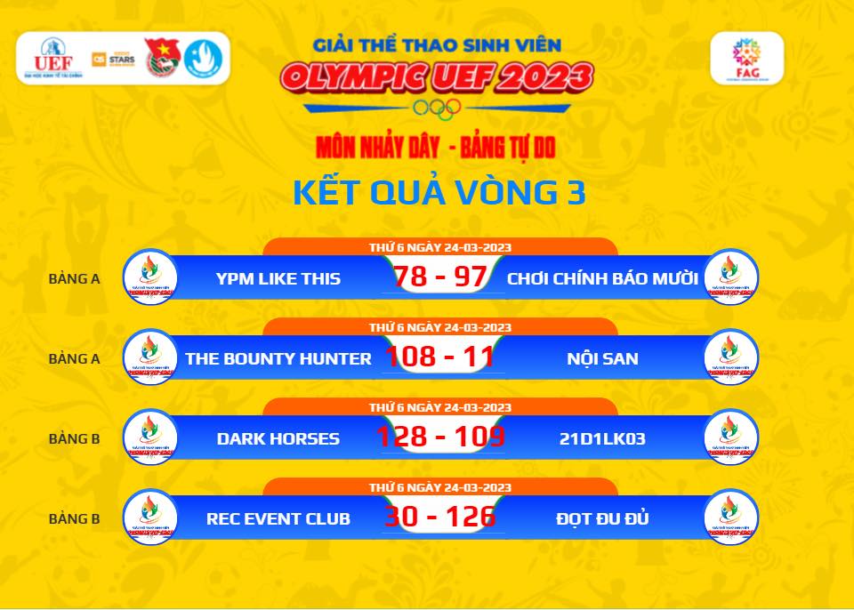 Đối với bộ môn nhảy dây, kết quả thi đấu được ghi nhận như sau: ở bảng A, chiến thắng gọi tên hai đội: Chơi chín báo mười và The Bounty Hunter; bảng B là Dark Horses và Đọt Đu Đủ.