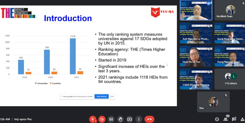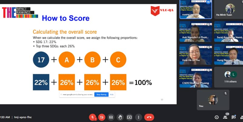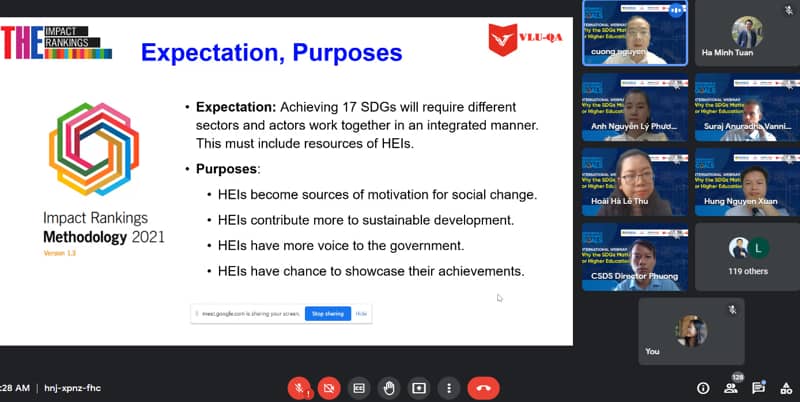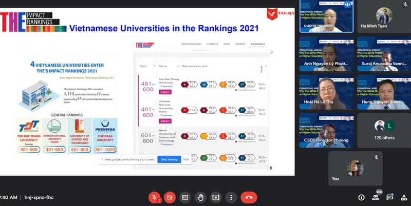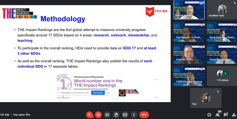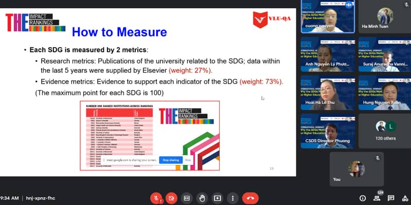 Đối với tổ chức xếp hạng theo SDGs, TS. Nguyễn Hữu Cương đã chia sẻ về The Impact Ranking – Hệ thống duy nhất xếp hạng các trường đại học theo 17 mục tiêu phát triển bền vững của Liên hợp quốc. Diễn giả đã chia sẻ chi tiết về mục tiêu, phương pháp, cách thức chấm điểm và đo lường của The Impact Ranking. Trong bảng xếp hạng The Impact Ranking năm 2021, Việt Nam cũng có 4 trường đại học góp mặt.