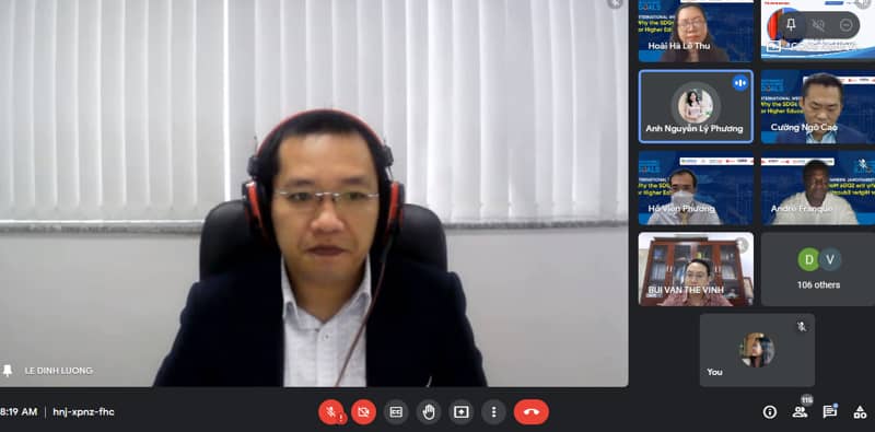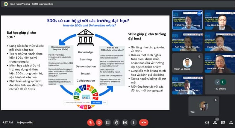 Về mối liên hệ giữ SDGs và trường đại học, ông Đôn Tuấn Phương cho biết SDGs giúp các trường đại học gia tăng nhu cầu giáo dục về SDGs; Đưa ra một định nghĩa toàn diện, được chấp nhận toàn cầu về trường đại học có trách nhiệm; Cung cấp một khung minh họa và đánh giá tác động; Tạo ra nguồn/luồng tài trợ mới; mở rộng hợp tác với các đối tác mới trong và ngoài nước. Bên cạnh đó, diễn giả cũng chia sẻ về vai trò của các trường đại học đối với SDGs và những điều các trường cần làm để đưa SDGs vào chương trình đào tạo.