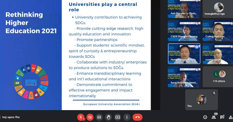 Với sư quy mô của webinar cùng những chia sẻ bổ ích của các diễn giả, giảng viên và sinh viên Nhà UEF đã bổ sung được nhiều kiến thức mới về SDGs nói riêng và vai trò của SDGs trong nền giáo dục đại học nói chung.