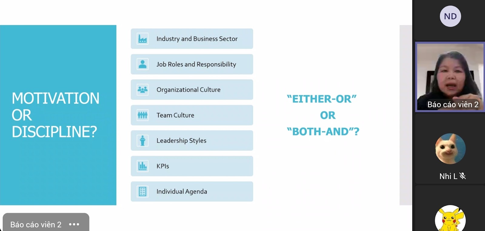 Trong phần báo cáo của diễn giả Hải Bằng, vấn đề tạo động lực hay kỷ luật đối với nhân viên cũng được phân tích cụ thể qua các yếu tố: lĩnh vực công nghiệp và kinh doanh, trách nhiệm và vai trò công việc, văn hóa có tổ chức, nhóm văn hóa, phong cách lãnh đạo, KPIs, chương trình cá nhân.