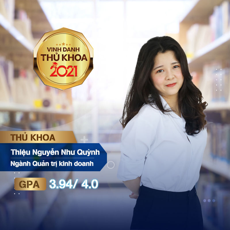 Như Quỳnh trở thành tân Thủ khoa ngành Quản trị kinh doanh với điểm số trung bình tích lũy 3.94/4.00. Cô tân Thủ khoa cũng vinh dự nhận Học bổng tài năng ba năm liền (2018 – 2020) và xuất sắc đạt giải Nhì cùng đồng đội trong cuộc thi “Biện luận sinh viên UEF S-Debate 2020” bảng tiếng Anh.