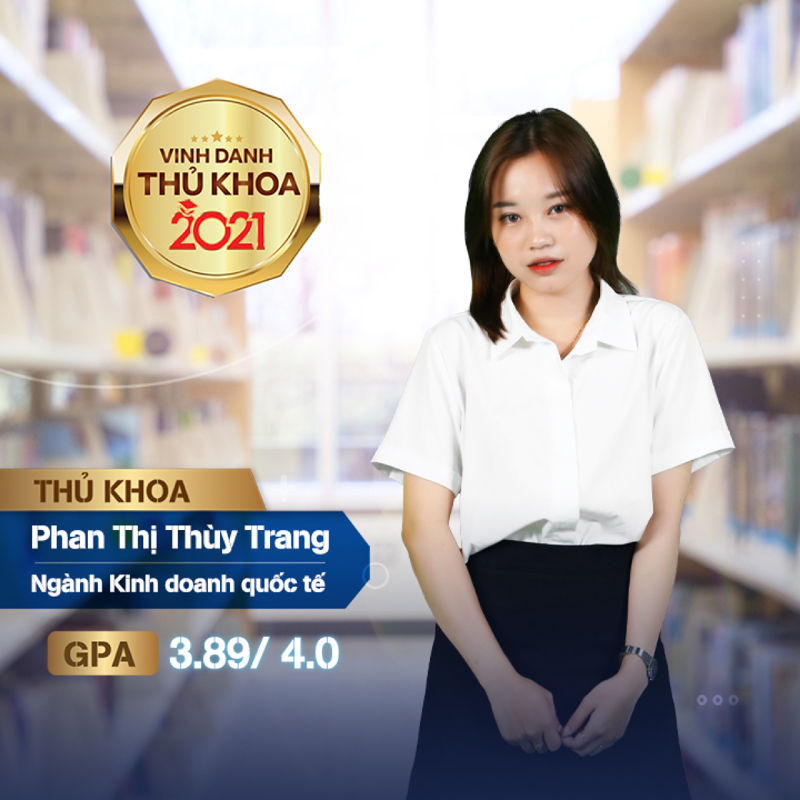 Vị trí tân Thủ khoa ngành Kinh doanh quốc tế đã thuộc về Phan Thị Thùy Trang với thành tích GPA 3.89/4.00. Nổi bật trong các hoạt động học thuật, Thùy Trang từng đạt Học bổng tuyển sinh 50% học phí toàn khóa học, vòng bán kết Giải thưởng Sinh viên NCKH Euréka 2019 và vòng bán kết cuộc thi Business Idea 2018, giải tư cuộc thi Logistics Talent 2019, giải ba NCKH cấp bộ 2019 và Học bổng tài năng 2020.