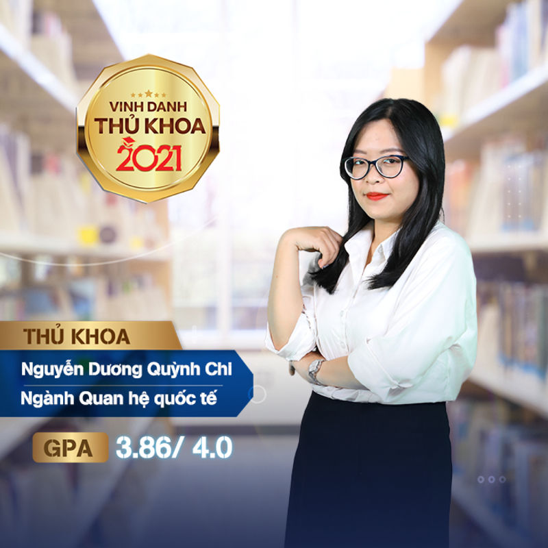 Quỳnh Chi đã xuất sắc ghi tên mình trên bảng vàng Thủ khoa ngành Quan hệ quốc tế với điểm GPA 3.86/4.00. Bạn cũng là một sinh viên có thành tích tiếng Anh xuất sắc với điểm TOEIC 980.