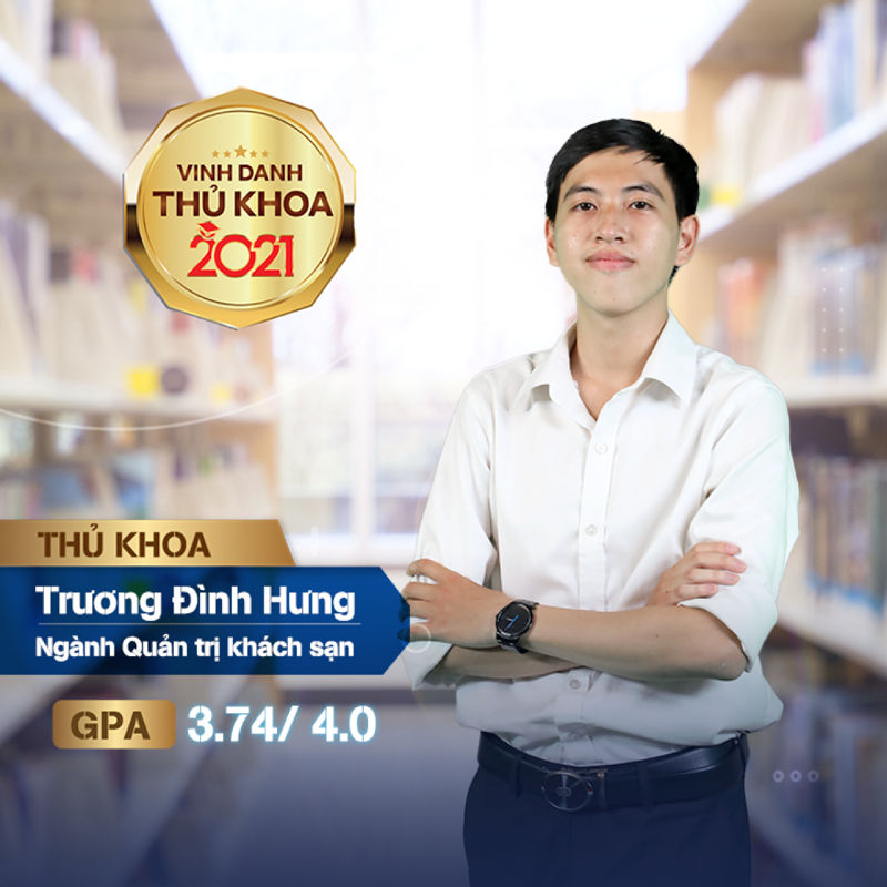 Đình Hưng là Thủ khoa ngành Quản trị khách sạn với điểm GPA 3.74/4.00. Bạn còn tích lũy cho mình những thành tích học thuật khác như giải Khuyến khích cuộc thi Sinh viên nghiên cứu khoa học 2020 cấp khoa và IELTS 7.0.