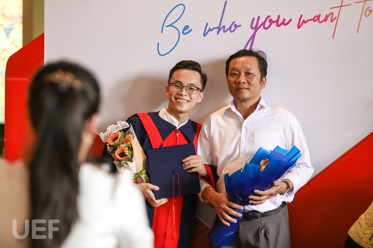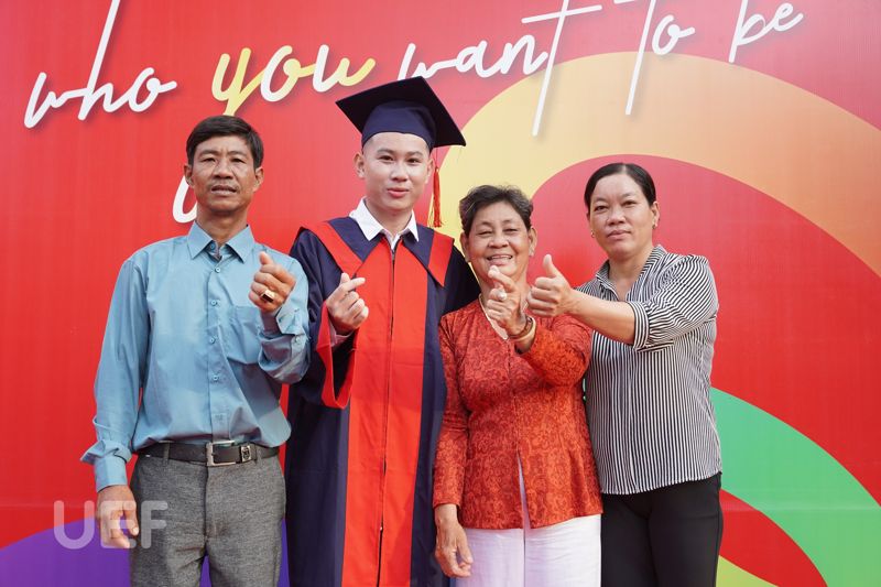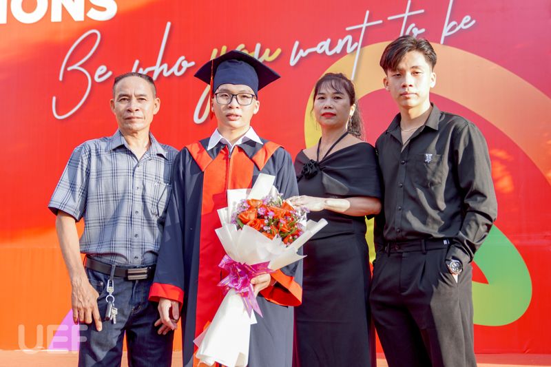 Sinh viên Văn Huy Sơn - tân cử nhân ngành Ngôn ngữ Anh cũng xúc động khi nói lời cảm ơn đến gia đình, đặc biệt là người mẹ thân yêu của cậu bạn - người đã luôn sát cánh cùng Huy Sơn từ bé cho đến giờ. Song song đó, Huy Sơn cũng rất biết ơn những thầy cô và bạn bè tại UEF đã giúp đỡ Sơn mọi lúc, ở mọi hoạt động, sân chơi trong 4 năm qua.