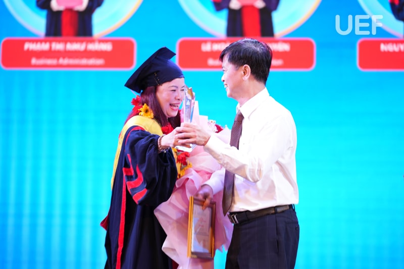 Từ giảng đường đến bục vinh danh, hành trình của tân Thạc sĩ Lê Hoàng Như Uyên - Thủ khoa ngành Quản trị kinh doanh là minh chứng cho bản lĩnh, trí tuệ và lòng kiên trì của một người không ngừng nỗ lực. Giữa những tràng pháo tay rộn ràng trong lễ tốt nghiệp, khoảnh khắc chị Như Uyên rạng rỡ nhận danh hiệu Thủ khoa là vinh quang cá nhân và niềm tự hào của gia đình, bạn bè và thầy cô đã đồng hành. Một cái cúi đầu cảm ơn, một ánh mắt đầy xúc động hòa quyện thành khoảnh khắc đẹp nhất của ngày tri ân và trưởng thành. Chị chia sẻ rằng, bản thân chọn quay lại học tập sau 10 năm đi làm vì muốn nâng cao năng lực lãnh đạo, hệ thống hoá kiến thức và đóng góp nhiều hơn cho ngành logistics. Học tại UEF là một hành trình đáng giá – từ phương pháp học hiện đại đến đội ngũ giảng viên đã giúp bản thân học hỏi nhiều kinh nghiệm lãnh đạo, quản trị, phát triển chiến lược