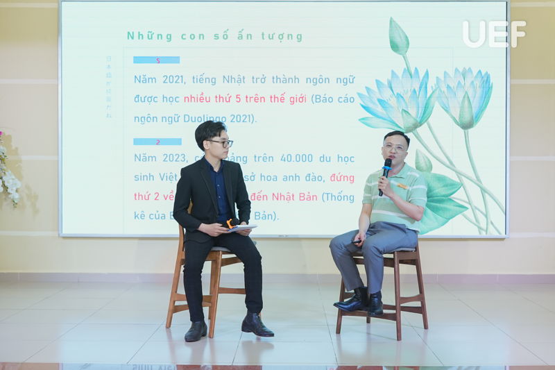 Đến với nội dung chính của chương trình, ThS. Cao Đỗ Quyền đã có những chia sẻ sâu sắc về sự phát triển mạnh mẽ của tiếng Nhật tại Việt Nam và trên thế giới. Thầy khẳng định, tiếng Nhật không chỉ là một ngoại ngữ thông dụng mà còn mở ra những cơ hội nghề nghiệp đáng giá. Việc trang bị tốt ngoại ngữ sẽ là “vũ khí” giúp các bạn nắm lấy được nhiều cơ hội việc làm tại đất nước mặt trời mọc. "Khi bạn chỉ biết một ngôn ngữ, bạn chỉ đang dọn hành lang cuộc đời mình. Còn nếu bạn biết thêm một thứ tiếng khác, cuộc đời bạn sẽ rộng mở hơn rất nhiều", thầy Quyền chia sẻ.