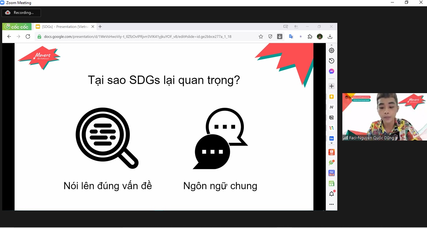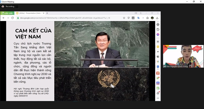 Nội dung chia sẻ của diễn giả Nguyễn Quốc Dũng lý giải về lý do và tầm quan trọng của SDGs. Diễn giả cũng chia sẻ về 169 chỉ tiêu để mô tả ý nghĩa từng mục tiêu và 232 chỉ số để đánh giá quá trình thực hiện các mục tiêu phát triển bền vững. Các bạn sinh viên được cung cấp các nguồn thông tin tin cậy để tìm hiểu thêm về SDGs.