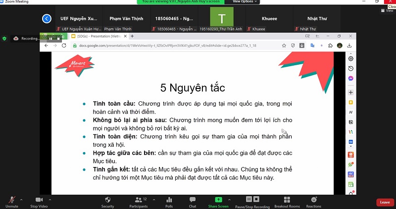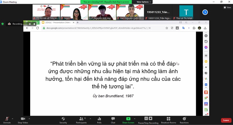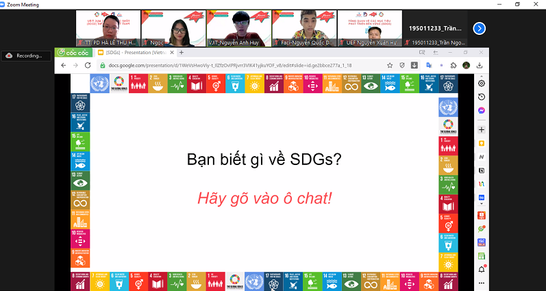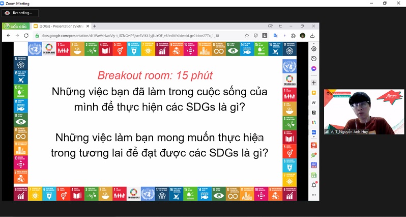Nhiều hoạt động của các bạn sinh viên nhằm thực hiện SDGs trong cuộc sống cũng được trình bày. Bạn Đỗ Thị Minh Khuê (sinh viên UEF đến từ Vũng Tàu) đã chia sẻ về các chuyến đi chơi, leo núi,… cùng các bạn và kết hợp thu dọn các rác thải ở các điểm dến và trên đường đi. Bạn Nguyễn Kim Yến Nhi chia sẻ bạn đang tham gia rất nhiều hoạt động nghiên cứu khoa học và các nhóm công tác xã hội để giúp đỡ các cá nhân kém may mắn trong cộng đồng. Quan tâm đến chất lượng giáo dục và môi trường, bạn Trần Ngọc Trân chia sẻ bạn rất tích cực giúp đỡ các bạn học gặp khó khăn và cùng các bạn tuyên truyền cho người dân nâng cao ý thức về phân loại rác thải tại nguồn. Bạn Lê Thị Nhật Thư chia sẻ trăn trở của bạn về chất lượng của các cơ sở giáo dục của Việt Nam so với quốc tế.