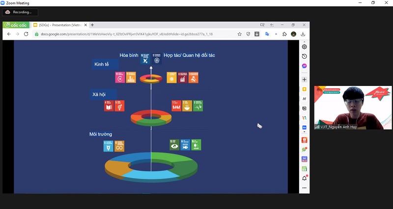 Với chủ đề về “Tổng quan về các mục tiêu phát triển bền vững (SDGs)”, diễn giả Nguyễn Anh Huy đã bắt đầu buổi chia sẻ với phần thông tin về Mục tiêu phát triển Thiên niên kỷ (MDGs) và kết quả thực hiện, qua đó truyền tải thông điệp về sự cần thiết về 17 Mục tiêu phát triển bền vững của Liên hiệp quốc (SGGs). Trong bài chia sẻ, sinh viên còn được tìm hiểu thêm về 5 nguyên tắc, 5 trụ cột của SDGs, mô hình “wedding cake”. Diễn giả cũng đề cao tinh thần khởi nghiệp đổi mới sáng tạo và vai trò của SDGs trong việc tìm ra các vấn đề, xây dựng ý tưởng khởi nghiệp.