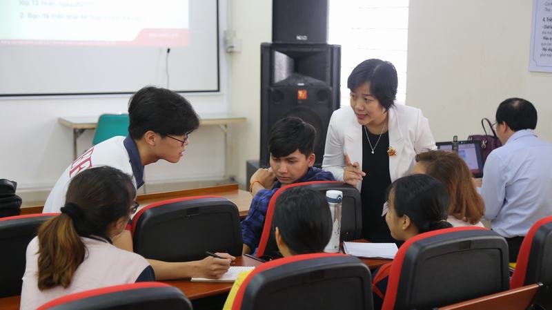 Bà Đỗ Xuân Nhung – Giám đốc nhân sự Dai-ichi Life trực tiếp hướng dẫn sinh viên UEF trong các thử thách thực hành