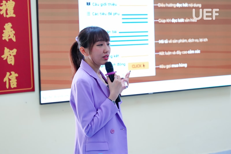 Nhằm cung cấp cho các bạn học sinh cẩm nang để tạo nội dung thiết thực, cô Thúy Vi đã phân tích các công thức viết content hiệu quả như 5W1H, AIDA, BAB, PAS. Cô cũng chia sẻ các mẫu content ấn tượng, nhấn mạnh vai trò của tiêu đề thu hút và trang bị bí quyết tạo tiêu đề hấp dẫn, truyền tải thông điệp cốt lõi. Diễn giả cũng lưu ý về những lỗi thường gặp khi sáng tạo content và đưa ra lời khuyên khắc phục.