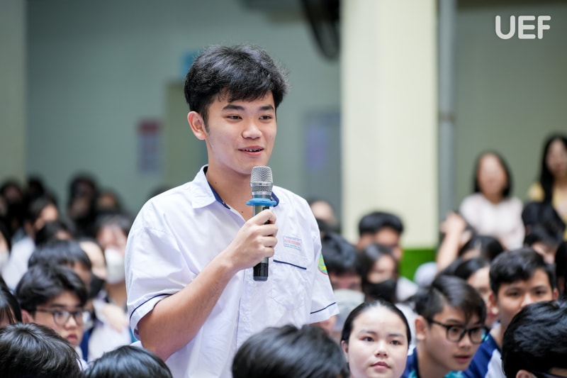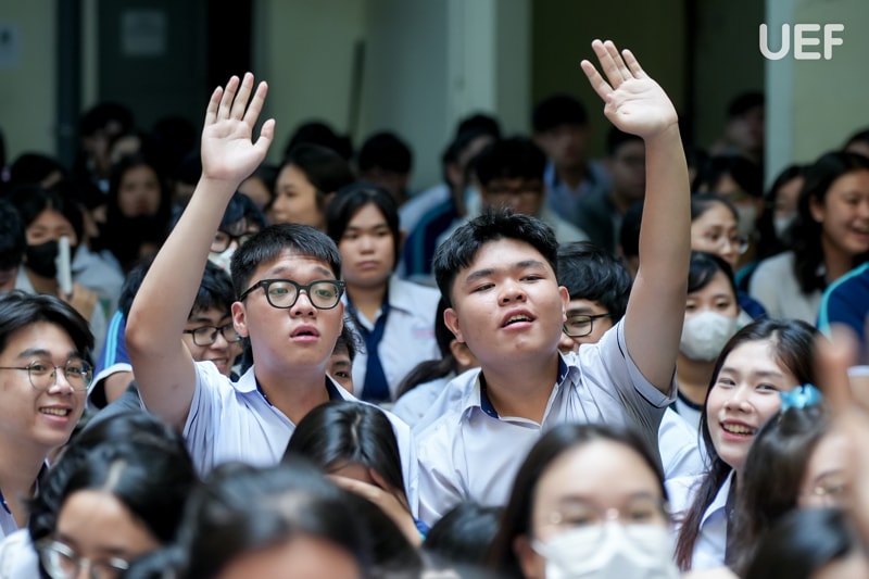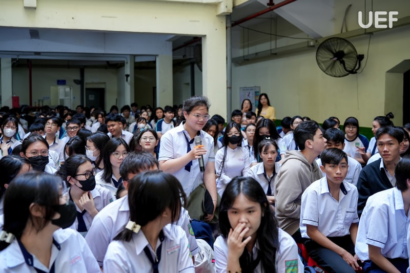 Không chỉ dừng lại ở việc truyền cảm hứng nghề nghiệp, chương trình còn cung cấp cho học sinh những thông tin thiết thực về kỳ thi THPT và kỳ tuyển sinh đại học năm 2025. ThS. Nguyễn Ngọc Thạch – Phó Giám đốc Trung tâm Tư vấn - Tuyển sinh UEF đã trực tiếp chia sẻ các phương thức xét tuyển hiện hành, các lưu ý và mốc thời gian quan trọng, điều kiện nộp hồ sơ, học bổng,... Trong đó, thầy nhắc nhở các bạn học sinh khối 12: “Từ hôm nay (21/4) đến 17g00 ngày 28/4 là thời gian chính thức các thí sinh phải đăng ký dự thi tốt nghiệp THPT”.