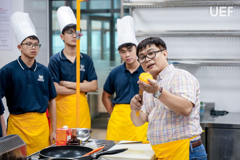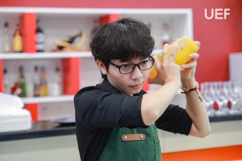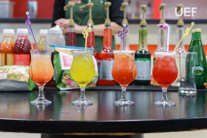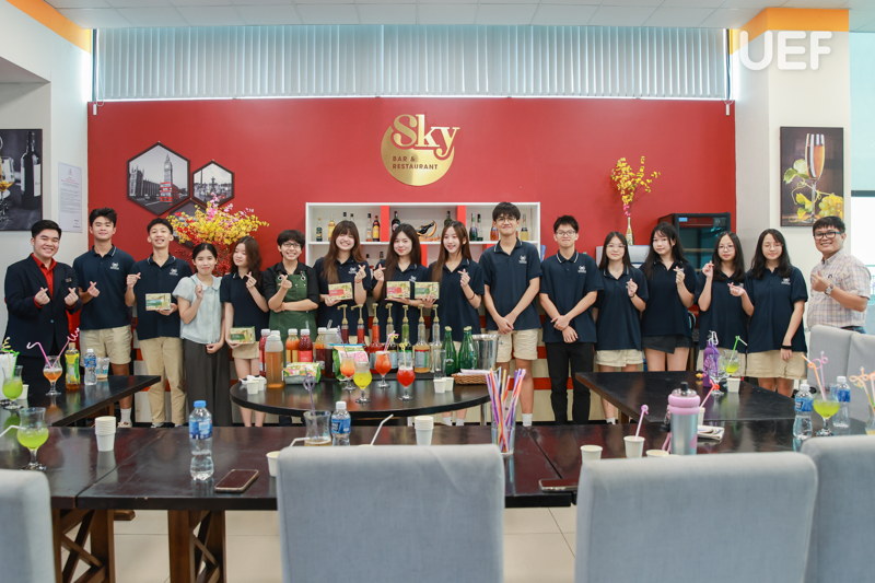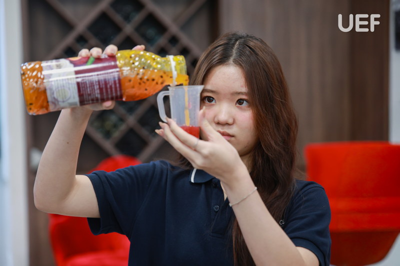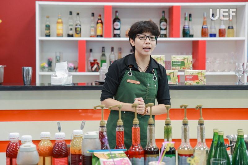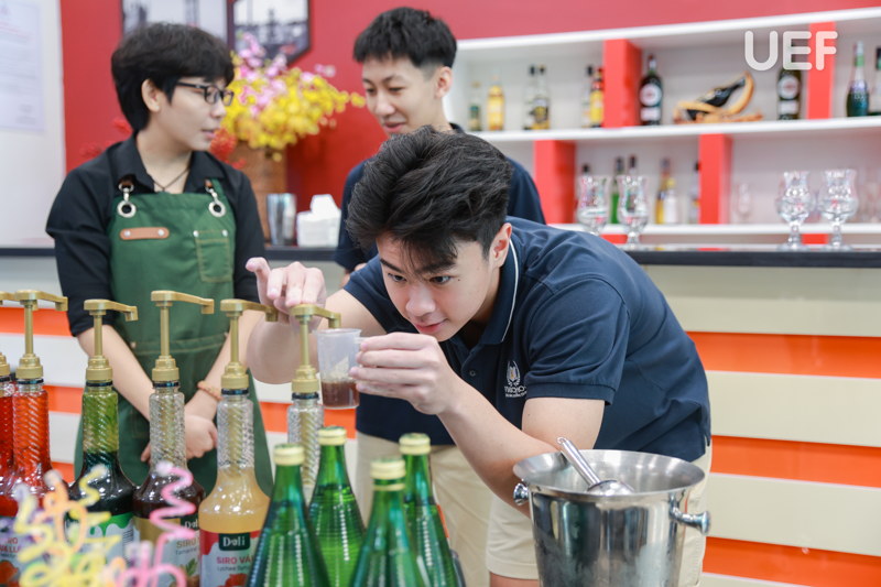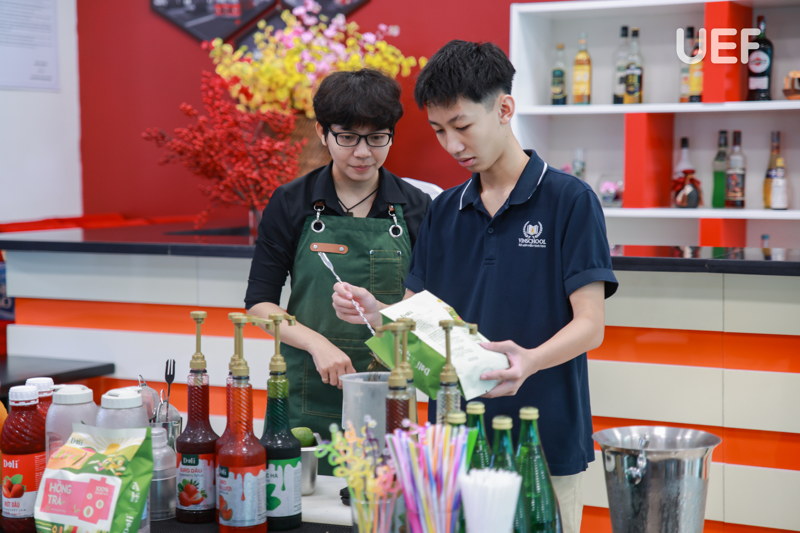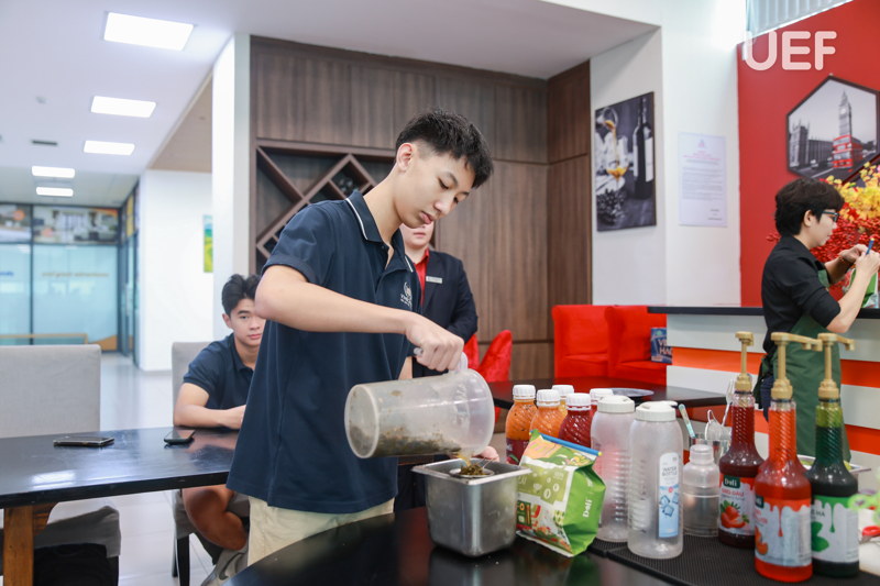 Sáng ngày 5/11, không gian thực hành khu vực quầy bar của UEF trở nên rộn ràng với sự tham gia học tập của nhóm học sinh Vinschool dưới sự hướng dẫn của cô Nguyễn Ngọc Xuân - Giám đốc bộ phận R&D TIM Corp và ThS. Nguyễn Viết Thủy - Phó Trưởng Khoa Quản trị du lịch - Khách sạn. Các bạn được hướng dẫn chi tiết kỹ thuật ủ trà, pha chế và tự tay sáng tạo ba món nước “signature” như: Trà me muối, Trà nhiệt đới và Soda vải bạc hà chanh dây.