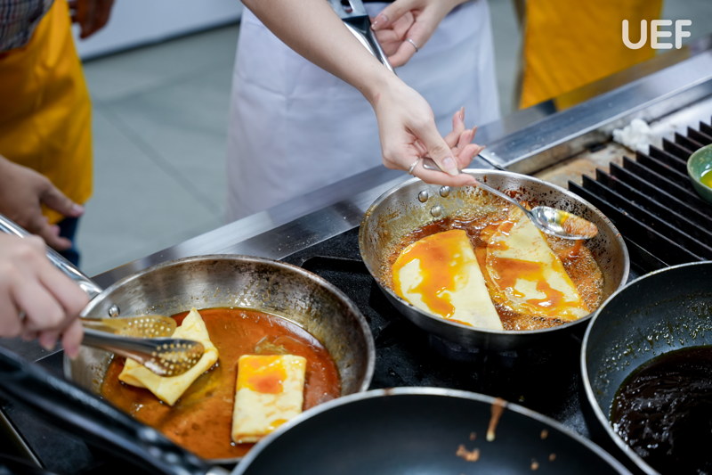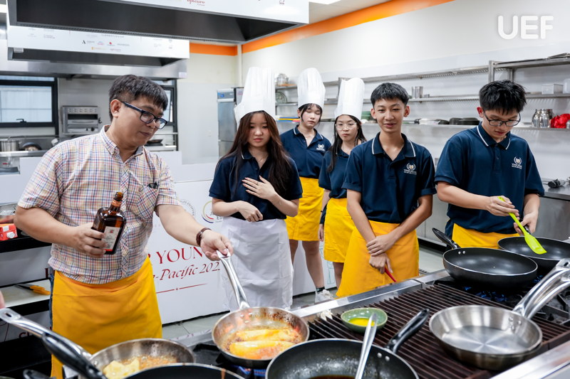 Đặc biệt trong buổi học còn tổ chức cuộc thi “Pha chế sáng tạo”. Tại đó, các bạn học sinh thỏa sức thể hiện gu thẩm mỹ và sự tinh tế trong từng ly nước. Nhiều công thức mới lạ, độc đáo đã làm cho giảng viên và chuyên gia ấn tượng. Chiều cùng ngày, các bạn tiếp tục vào bếp với món tráng miệng Pháp nổi tiếng - Crêpe Suzette. Dưới sự hướng dẫn của thầy Nguyễn Viết Thủy, các bạn học sinh được tự tay thực hiện toàn bộ quy trình, từ pha bột, tráng bánh, chế biến nước sốt đến màn flambé rực lửa đặc trưng.