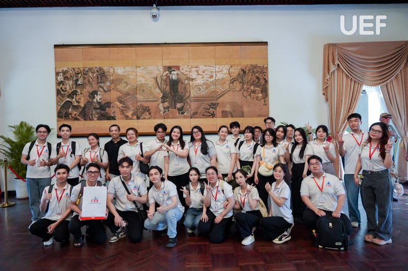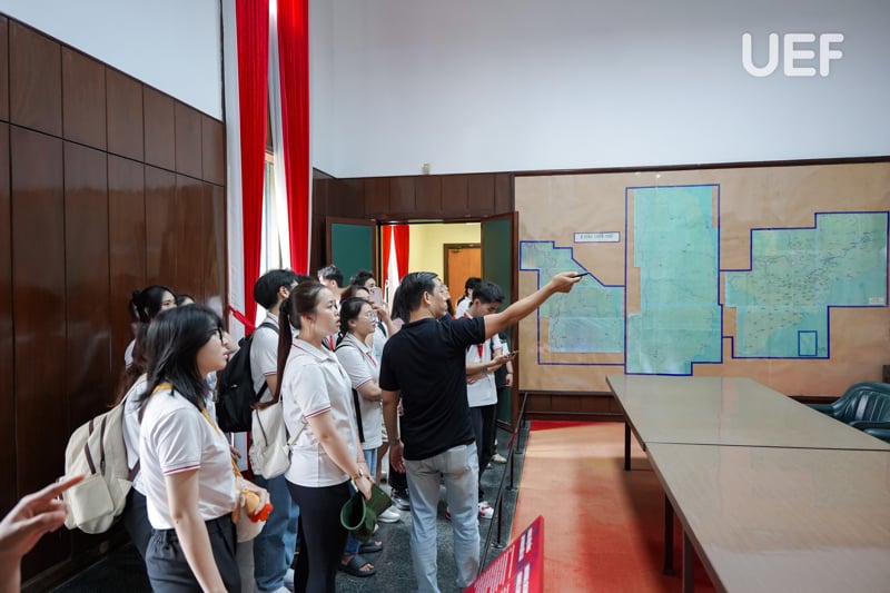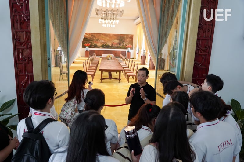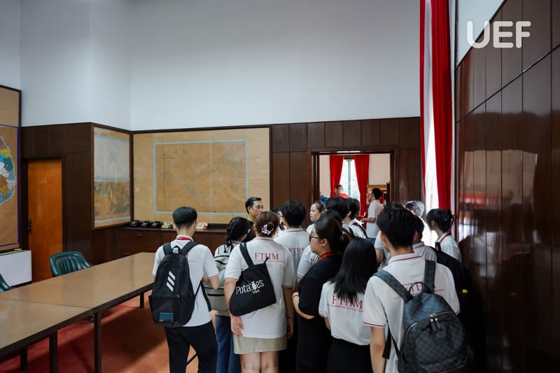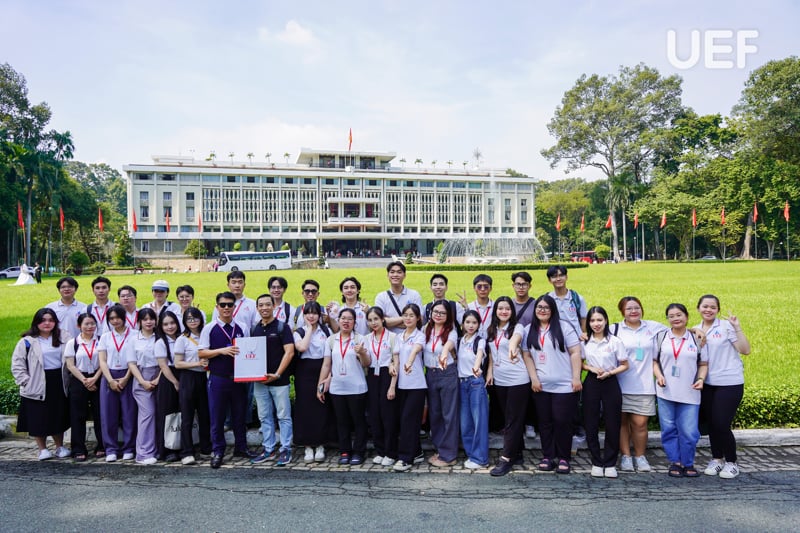 Trong chuyến tham quan, đoàn sinh viên UEF đã được nghe giới thiệu về Dinh Độc Lập - một trong những di tích lịch sử văn hóa quốc gia của dân tộc. Được xây dựng từ thời Pháp thuộc và gắn liền với nhiều sự kiện lịch sử quan trọng, nơi đây chứng kiến thời khắc thống nhất đất nước và hiện thời là một trong những địa điểm thu hút hàng triệu du khách trong và ngoài nước.