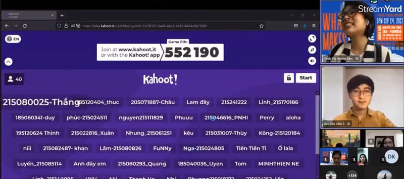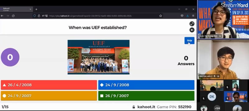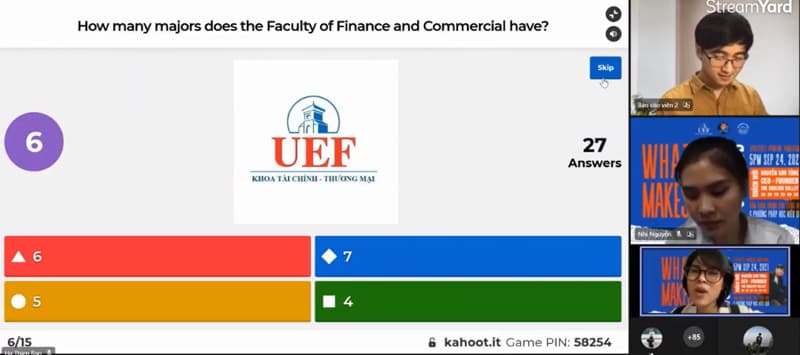 Bên cạnh lắng nghe chia sẻ từ chuyên gia, các bạn sinh viên cũng được rèn luyện khả năng đọc hiểu tiếng Anh thông qua trò chơi Kahoot. Các câu hỏi xoay quanh về năm thành lập UEF, các cơ sở của UEF, khoa Tài chính – Thương mại có bao nhiêu ngành,…
