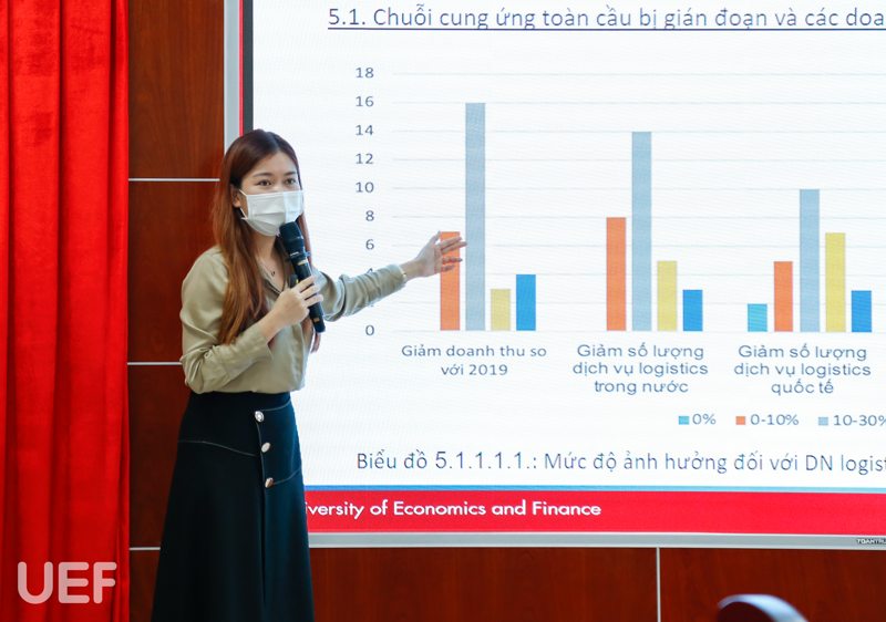 Mở đầu cho phần báo cáo, ThS. Trần Ngọc Nhã Vi đã đề cập đến vấn đề về “Ảnh hưởng của đại dịch Covid-19 đến các doanh nghiệp Logistics tại Việt Nam”. Theo đó, cô Vi đưa ra thực trạng của các doanh nghiệp đã bị ảnh hưởng, phân tích các số liệu dựa trên những nguồn tư liệu có được, từ đó, đề ra giải pháp mà đã được hầu hết doanh nghiệp xem là cần thiết: miễn giảm và hoãn các đợt thanh tra quản lý nhà nước; tạo ra cơ chế, đường dây nóng để liên tục trao đổi cập nhật; tăng cường thương mại điện tử, sàn giao dịch online;…