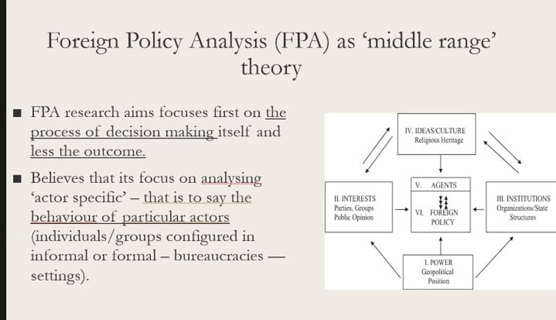 Để sinh viên dễ dàng nắm bắt, TS. Nguyễn Thành Trung đã tổng hợp các nhân tố chủ chốt quyết định chính sách đối ngoại của một quốc gia, trong đó có: Thế, lực và tính chính danh của quốc gia trên trường quốc tế; tình hình chính trị và an ninh thế giới; mục tiêu quốc gia mong muốn đạt được; ảnh hưởng của bộ máy hoạch định chính sách đối ngoại; và các nhân tố chính trị nội bộ (các nhóm lợi ích, giới truyền thông, công luận).