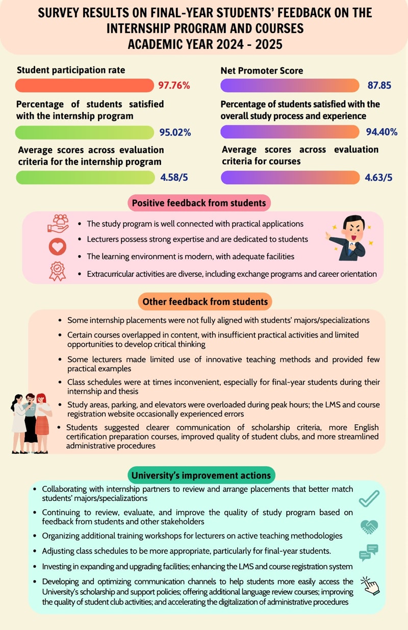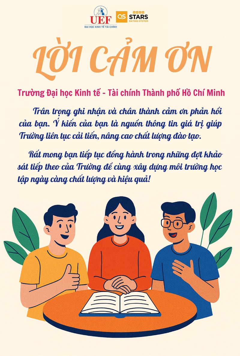 Trong năm học 2024 - 2025, Trường Đại học Kinh tế - Tài chính Thành phố Hồ Chí Minh (UEF) đã triển khai khảo sát ý kiến sinh viên (SV) năm cuối về chương trình thực tập và khóa học. Trường trân trọng cảm ơn sự tham gia tích cực của các bạn sinh viên và thông tin đến các bạn về kết quả khảo sát toàn trường như sau: