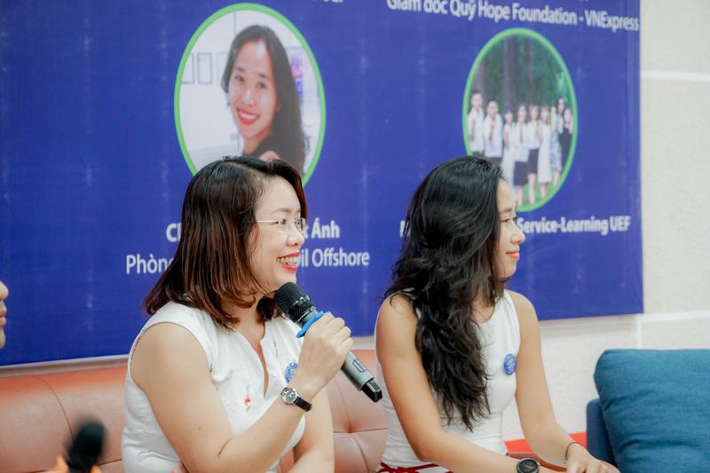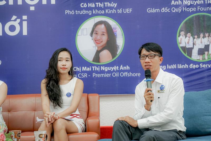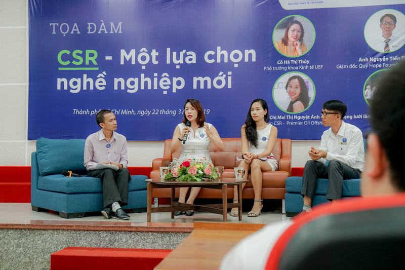 Đồng hành chia sẻ, giao lưu với các bạn sinh viên là các chuyên gia: ThS. Hà Thị Thủy – Phó Trưởng khoa Kinh tế UEF – Nghiên cứu sinh tiến sĩ về CSR trong doanh nghiệp; Anh Nguyễn Tiến Danh – Sáng lập viên/Chủ tịch Hội tình nguyện chung tay vì cộng đồng, Giám đốc Quỹ Hope Foundation của VnExpress; Chị Mai Thị Nguyệt Ánh – Thành viên phòng CSR công ty Premier Oil Offshore (Anh Quốc). MC dẫn dắt buổi tọa đàm là anh Phạm Trường Sơn – Phó giám đốc Trung tâm Hỗ trợ phát triển cộng đồng LIN.