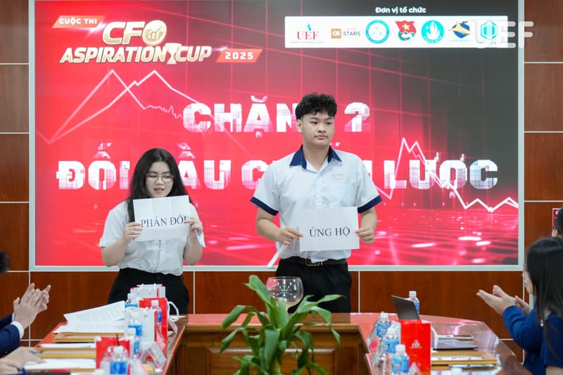 Sang chặng 2 “Đối đầu chiến lược”, các đội được chia thành hai cặp, bốc thăm quan điểm “Ủng hộ” hoặc “Phản đối”, sau đó phân tích và trình bày lập luận xoay quanh các tình huống thực tế trong lĩnh vực tài chính, đầu tư. Phần thi này đòi hỏi thí sinh không chỉ nắm vững kiến thức chuyên môn mà còn thể hiện tư duy phản biện, kỹ năng trình bày và khả năng làm việc nhóm.