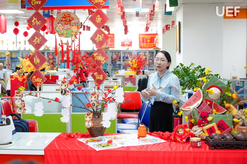 Từ sảnh chính, hành lang, khu vực sinh hoạt chung đến các văn phòng làm việc của đơn vị, mỗi góc nhỏ đều được chăm chút bằng những chi tiết Xuân gần gũi. Không gian đại học hiện đại khoác lên mình “chiếc áo mới”, dung hòa giữa nét trẻ trung và tinh thần Tết cổ truyền, tạo nên những điểm dừng chân đầy cảm xúc cho UEFers trong những ngày cận Tết.