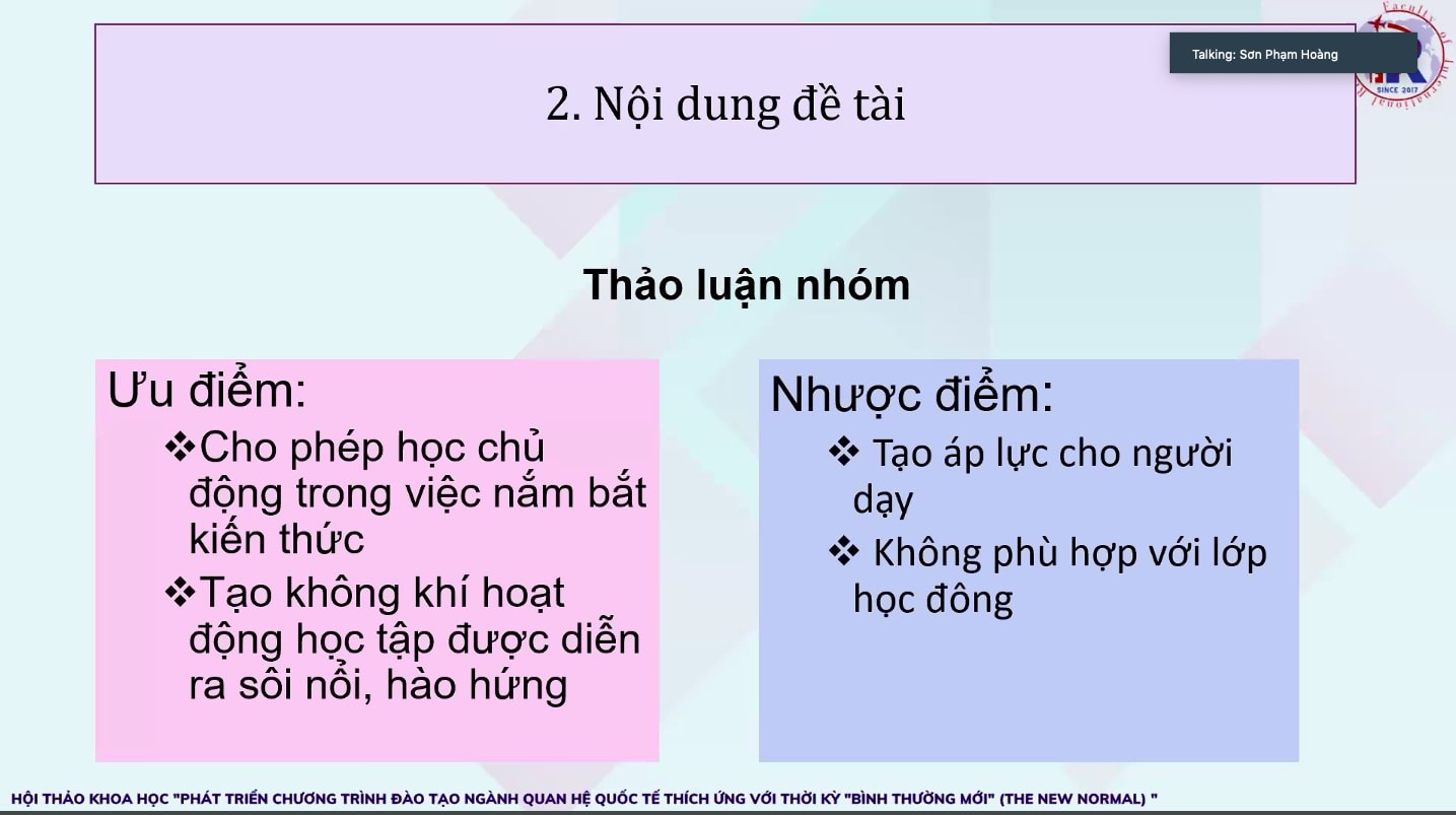 Ở phiên báo cáo đầu tiên, các đề tài được trình bày gồm: “Những vấn đề đặt ra với phương pháp giảng dạy ngành học Quan hệ quốc tế từ sau đại dịch Covid 2020” - TS. Đào Minh Hồng, Khoa Quan hệ quốc tế UEF, “Công tác đối ngoại Thành phố Hồ Chí Minh trong bối cảnh bình thường mới và thực trạng nguồn nhân lực đối ngoại của Thành phố Hồ Chí Minh hiện nay - một số đề xuất” - ông Trần Đình Vũ Hải - Phó Phòng Chính trị Kinh tế Đối ngoại, Sở Ngoại vụ TPHCM, “Ngành Quốc tế học - Đại học Sư phạm Thành phố Hồ Chí Minh đổi mới phương thức dạy và học dưới tác động của dịch bệnh Covid-19 (từ tháng 3/2020 - 6/2021)” - TS. Nguyễn Minh Mẫn - Trưởng Bộ môn Quốc tế học, ĐH Sư phạm TP.HCM, “Đổi mới phương pháp giảng dạy ngành Quan hệ quốc tế thích ứng với thời kỳ bình thường mới” - Thầy Đồng Minh Quang - Cử nhân ngành Quan hệ quốc tế, Đại học KHXH&NV, ĐHQG TP.HCM.