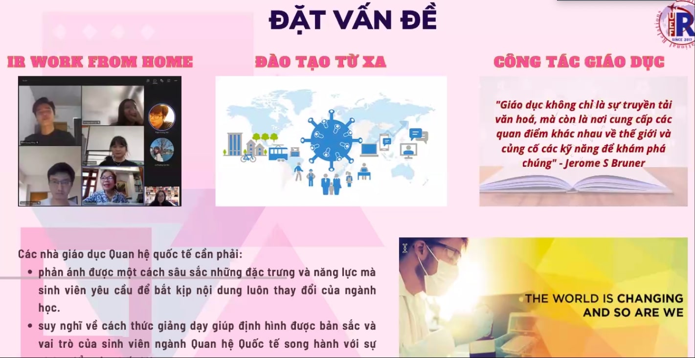 Mở đầu buổi hội thảo, TS. Trần Thanh Huyền - Trưởng khoa Quan hệ quốc tế UEF đã trình bày báo cáo đề dẫn với chủ đề “Thế giới đã thay đổi - Chúng ta phải thay đổi". Báo cáo xoay quanh vấn đề về đặc điểm của thời kỳ “The New Normal” (Bình thường mới) và thế giới đã thay đổi thế nào từ khi xuất hiện đại dịch Covid, công dân toàn cầu bền vững đòi hỏi những yếu tố gì khác với công dân toàn cầu trước 2020, và ngành Quan hệ quốc tế sẽ phải thay đổi ra sao để đáp ứng được với mục tiêu đào tạo ra những công dân toàn cầu bền vững.