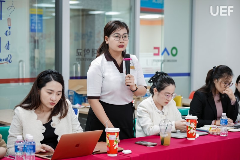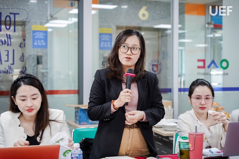 Trong phần trao đổi, các nội dung liên quan đến công tác đào tạo tại UEF, phương pháp giảng dạy chuyên ngành, học phần tự chọn, quy trình thực tập và chuyên đề/khóa luận tốt nghiệp đã được thảo luận thống nhất. Nhiều giảng viên đã chia sẻ trải nghiệm thực tế trong giảng dạy, góp phần làm rõ vai trò đồng hành, dẫn dắt của "người thầy". Đáng chú ý, ThS. Nguyễn Thị Kim Thoại giới thiệu phương pháp dạy học phát triển năng lực gắn với tháp Learning Pyramid, nhấn mạnh hiệu quả của học qua trải nghiệm, thảo luận và thực hành.