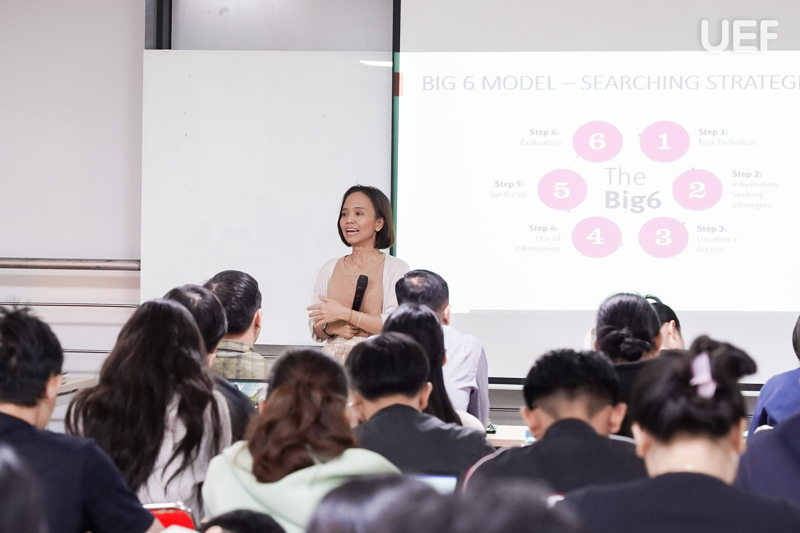 Trong gần hai giờ chia sẻ và thảo luận, sinh viên được hướng dẫn tìm kiếm và đánh giá tài liệu trên các nguồn học thuật uy tín như Google Scholar và hệ thống các thư viện. Diễn giả giới thiệu nhiều mô hình quan trọng trong việc sàng lọc và đánh giá thông tin, tiêu biểu là mô hình Big 6, giúp xác định nhu cầu thông tin, tìm kiếm, tổng hợp và đánh giá kết quả. Ngoài ra còn có mô hình CRAAP với 5 tiêu chí: Currency, Relevance, Authority, Accuracy, Purpose, tạo thành khung tham chiếu được sử dụng rộng rãi trong các trường đại học quốc tế.