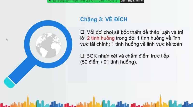 Tại vòng loại: Thí sinh sẽ được làm bài trắc nghiệm online 60 câu trong thời gian 45 phút (40 câu tiếng việt, 20 câu tiếng anh) liên quan đến lĩnh vực kế toán, tài chính và các kiến thức kinh tế xã hội.