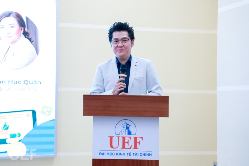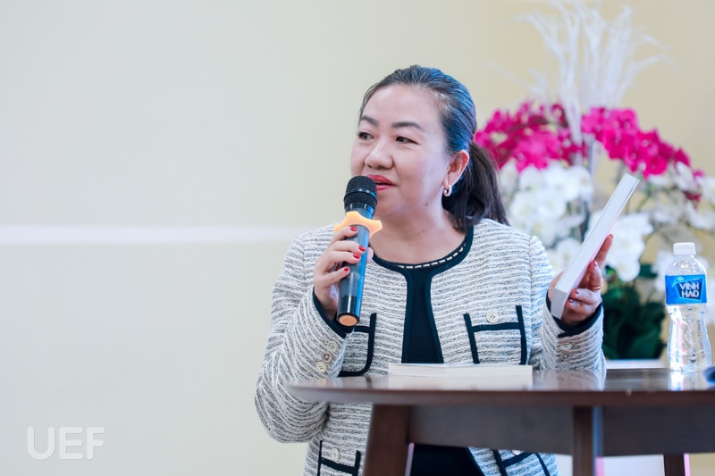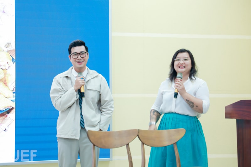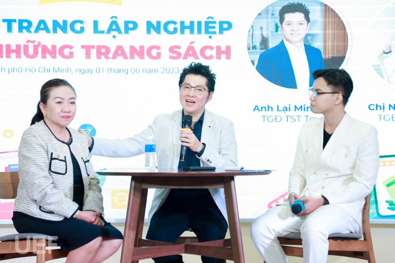 Trong khuôn khổ chương trình, UEFers đã được lắng nghe câu chuyện về "Hành trang lập nghiệp qua những trang sách" của hai doanh nhân là những người đã gắn bó nhiều năm cùng sách. Nếu như đối với anh Lại Minh Duy - Tổng Giám đốc TST Tourist, “cơ sở trưởng thành là văn hóa đọc, tích lũy và sàng lọc kiến thức” thì chị Nhan Húc Quân - Tổng Giám đốc NewToyo Việt Nam cho biết điểm mấu chốt giúp chị cân bằng giữa những bộn bề công việc, gia đình và viết sách xuất phát từ tình thương và trách nhiệm.