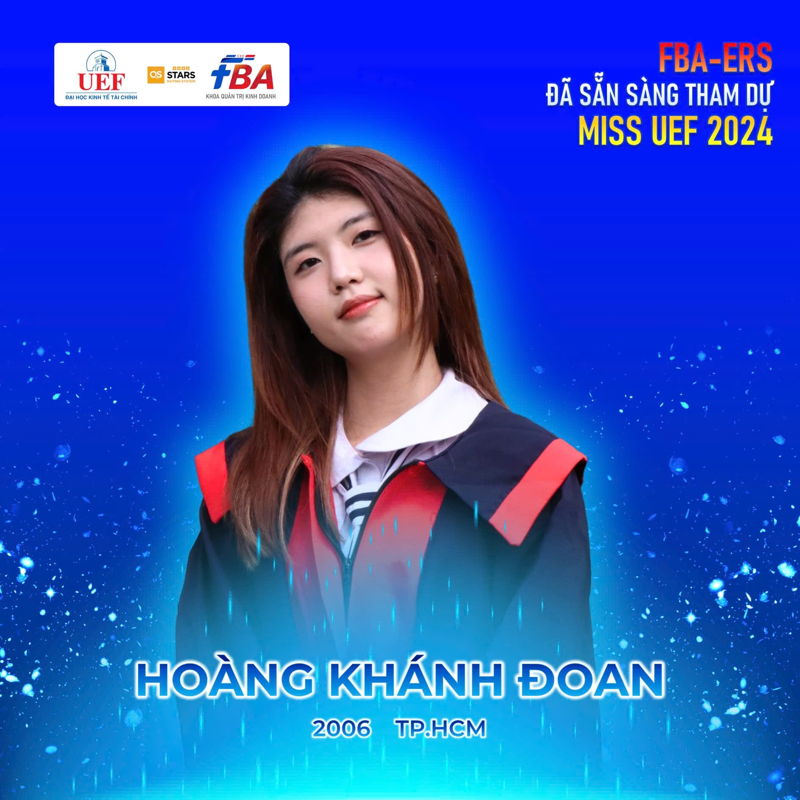 Là một trong những “bóng hồng” đại diện Nhà FBA không chỉ sở hữu vẻ đẹp rực rỡ mà còn mang đầy tinh thần nhiệt huyết, bạn Hoàng Khánh Đoan - Ngành Quản trị kinh doanh tham gia Miss UEF 2024 với mong muốn truyền tải những thông điệp ý nghĩa và khẳng định giá trị của nữ sinh khoa Quản trị kinh doanh.