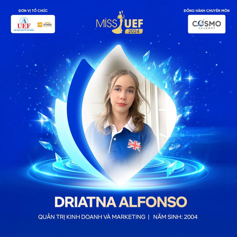 Bên cạnh đó, Miss UEF 2024 năm nay cũng chào đón những cô nàng du học sinh đang học tập tại UEF. Bạn Driatna Alfonso - Sinh viên Viện Quốc tế, ngành Quản trị kinh doanh và Marketing đến từ đất nước Cuba chia sẻ về châm ngôn sống của bản thân: “To always give my best, because every challenge is an opportunity to grow and show who I truly am” (Luôn nỗ lực hết mình, vì mỗi thử thách đều là cơ hội để trưởng thành và thể hiện con người thật của mình).
