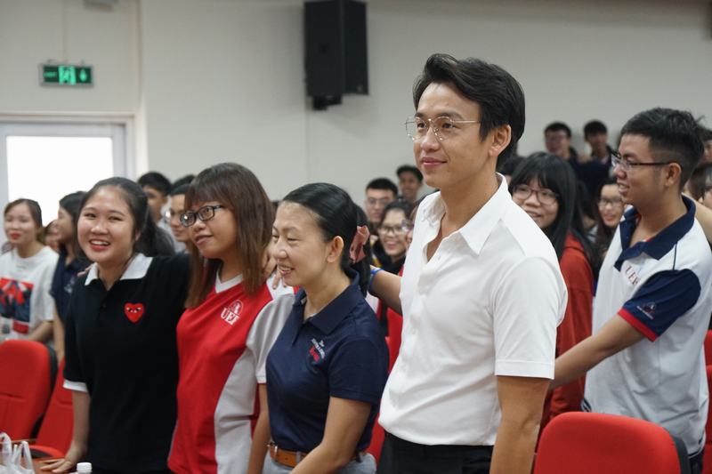 Chàng MC điển trai Quang Bảo không chỉ là khách mời đặc biệt mà còn đóng vai trò là nhân vật chính của chương trình. Những chia sẻ xoay quanh câu chuyện có thật của bản thân đã mang đến cho sinh viên UEF nhiều kỹ năng, kiến thức bổ ích về vai trò lãnh đạo của người trẻ.
