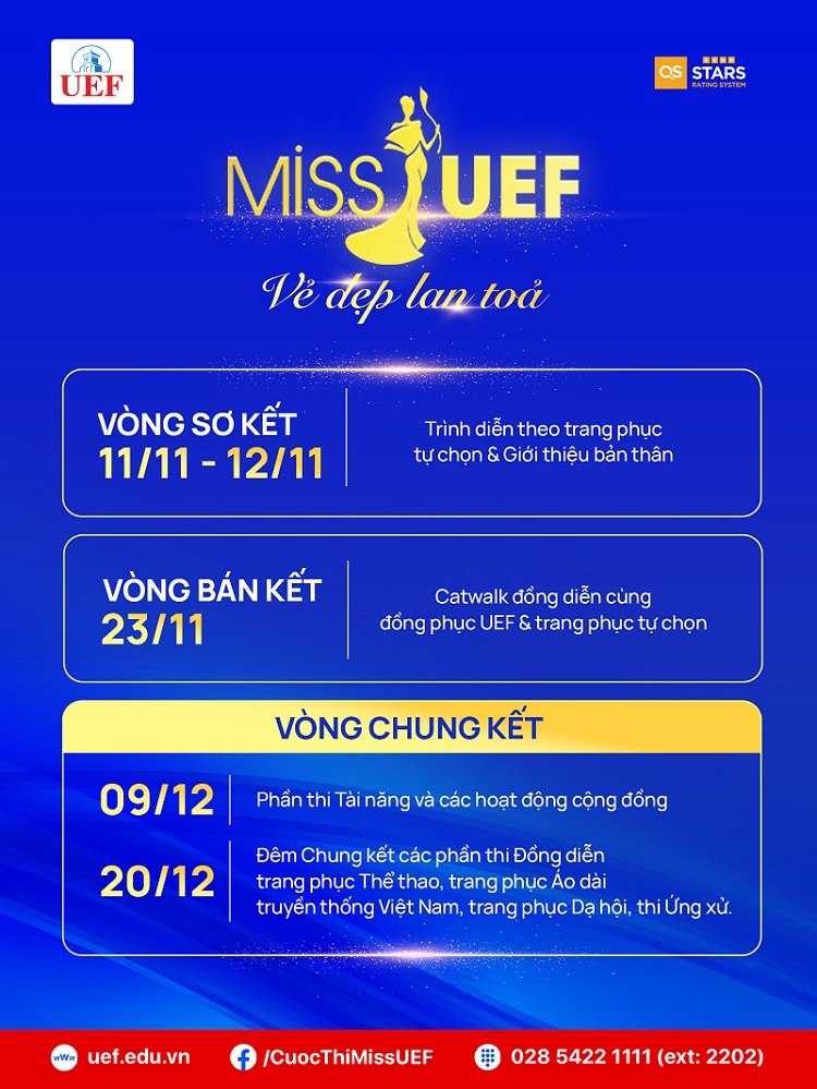 - Nữ sinh viên (kể cả sinh viên nước ngoài) hiện đang theo học tại Trường Đại học Kinh tế - Tài chính TP. Hồ Chí Minh (UEF) có chiều cao tối thiểu từ 1m55 trở lên, ngoại hình cân đối