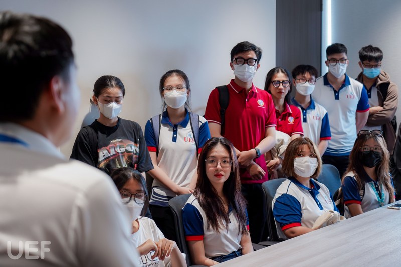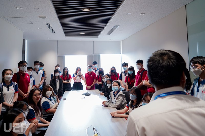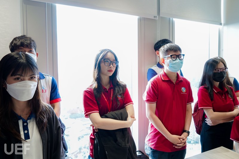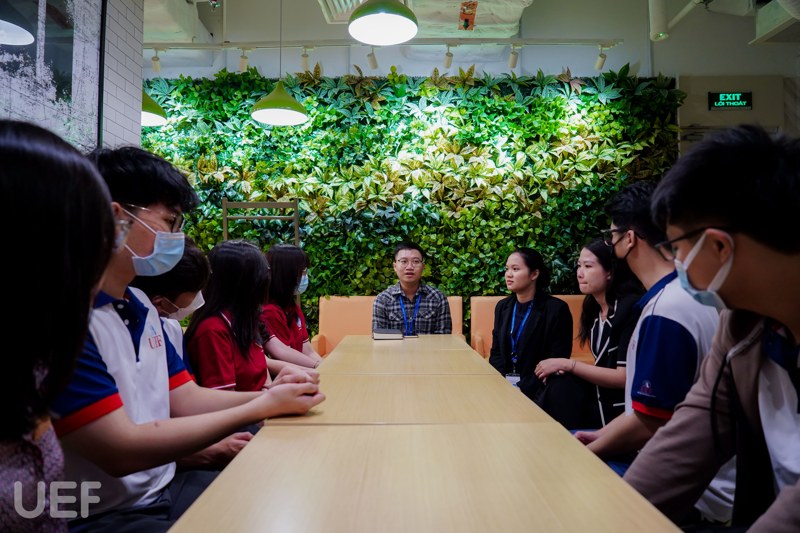 Ở một khu vực khác của văn phòng, sinh viên UEF gặp gỡ các anh chị nhân viên và cùng làm rõ nhiều vấn đề mới xoay quanh việc có nên thực tập sớm hay chỉ nên tập trung học đến khi ra trường hoặc sau khi ra trường, sinh viên cần học thêm những kỹ năng, bằng cấp nào?.