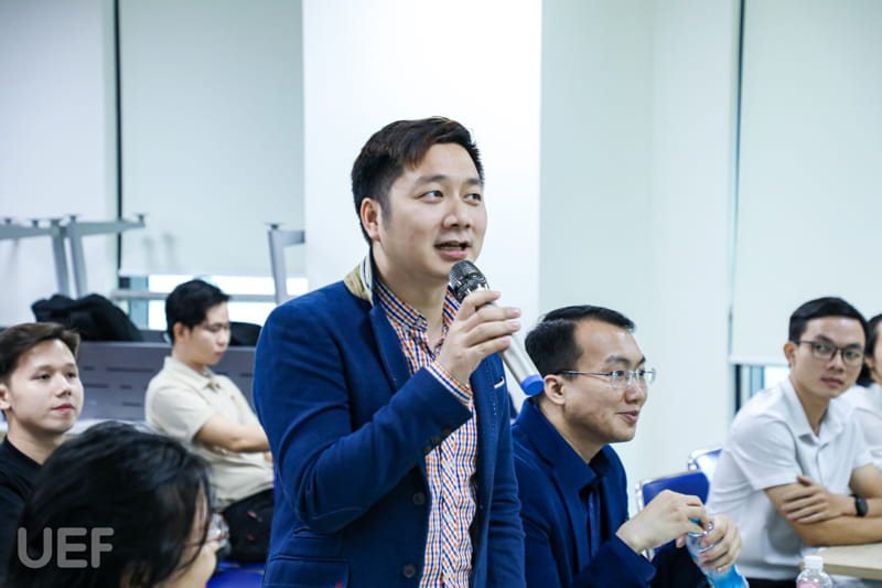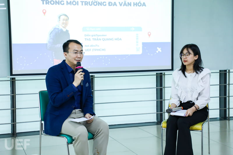 Về phần chia sẻ của ThS. Trần Quang Hòa, nội dung được thầy chia thành 2 phần chi tiết: giao tiếp trên môi trường mạng và giao tiếp trong môi trường đa văn hóa. Sinh viên UEF rất hứng thú với 2 nội dung thầy mang đến trong buổi talkshow.
