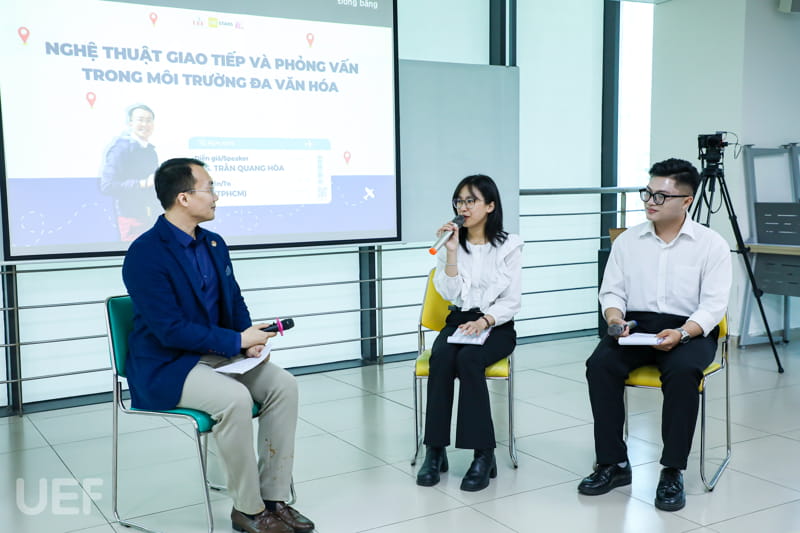 Giao tiếp là một nghệ thuật nhưng không phải ai cũng vận dụng tốt vào công việc, đời sống. Đặc biệt, trong bối cảnh hội nhập, kỹ năng giao tiếp "xuyên quốc gia" lại càng trở nên quan trọng. Nhằm tăng cường kỹ năng này cho sinh viên, Khoa Quan hệ công chúng và Truyền thông UEF đã tổ chức talkshow “Nghệ thuật giao tiếp và phỏng vấn trong môi trường đa văn hóa” vào 1/4 vừa qua. Chương trình được dẫn dắt bởi diễn giả ThS. Trần Quang Hòa.