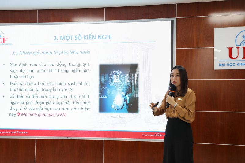 Được biết, trong số các đề tài tham gia, Ban tổ chức đã chọn ra 4 đề tài có tính thời sự để báo cáo và thảo luận tại buổi hội thảo. Đó là các đề tài: Ứng dụng trí tuệ nhân tạo (AI) trong các doanh nghiệp tại Việt Nam hiện nay, cơ hội và thách thức dành cho nguồn nhân lực của ThS. Đặng Thanh Thuỷ - giảng viên khoa Kinh tế UEF; Đề tài Sinh viên và sự chuẩn bị các điều kiện cho thị trường lao động thời kỳ cách mạng công nghệ 4.0 của TS. Nguyễn Tuấn Anh; Đề tài Quan điểm và giải pháp chủ yếu hướng đến phát triển nguồn nhân lực chất lượng cao ngành Tài chính – Ngân hàng trong cách mạng công nghiệp 4.0 của PGS.TS. Trần Mai Ước và đề tài Sự cần thiết của kế toán trách nhiệm xã hội và định hướng đào tạo kế toán TNXH trong nền Kinh tế số của ThS. Hà Thị Thuỷ.