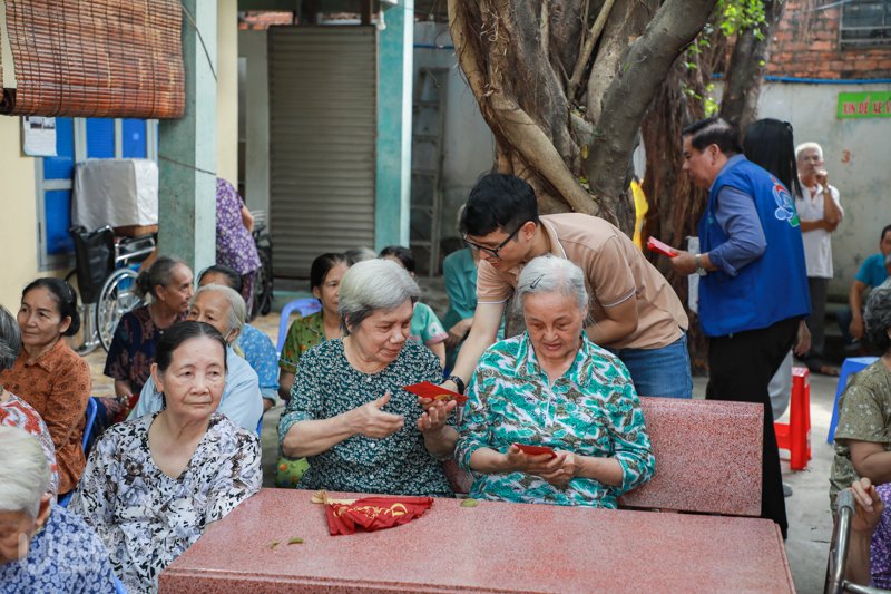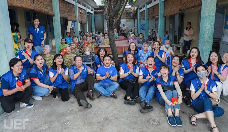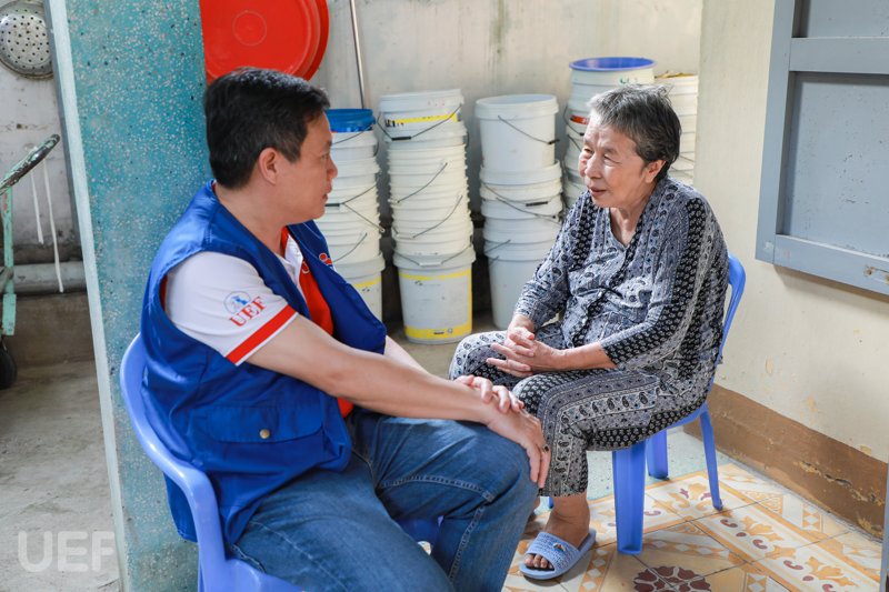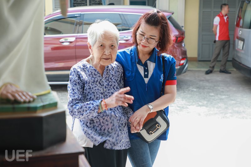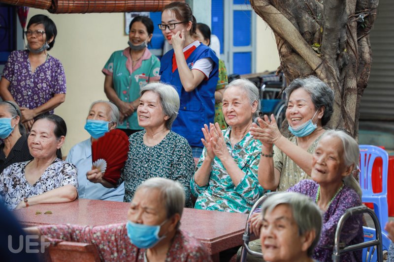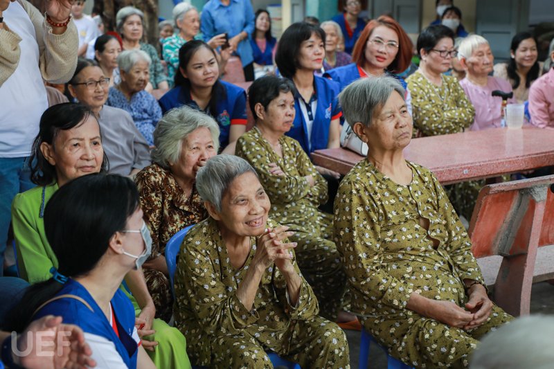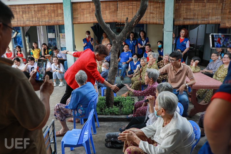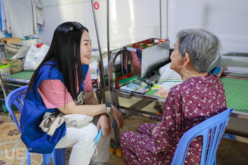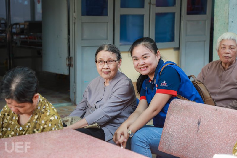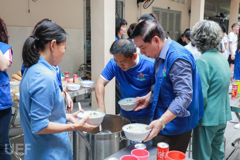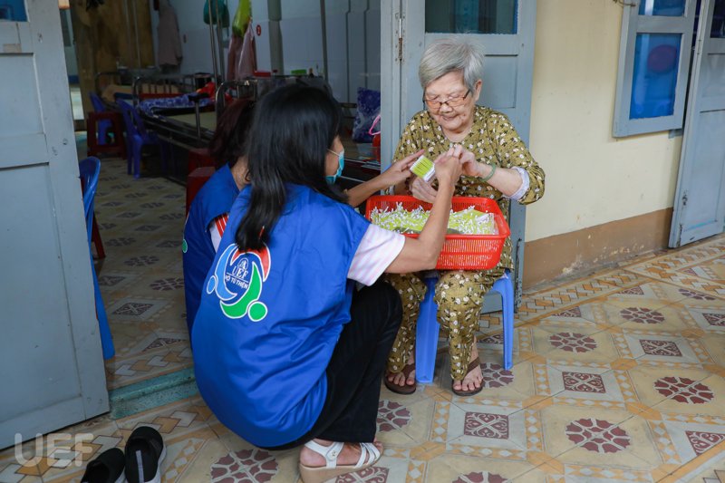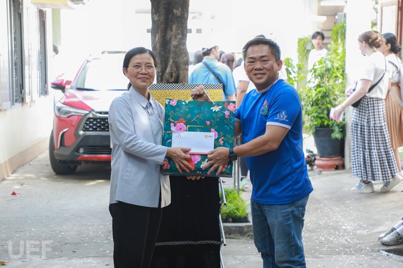 Đến với mái ấm, các thầy, cô UEF đã chung tay hỗ trợ trang trí không gian Tết, trò chuyện động viên và trao tặng bao lì xì mừng tuổi đến các cụ. Đặc biệt, các thành viên trong đoàn còn phối hợp với nhà bếp của mái ấm hỗ trợ chuẩn bị bữa cơm tất niên, mang lại không khí ấm cúng, thân tình cho những hoàn cảnh neo đơn tại đây.