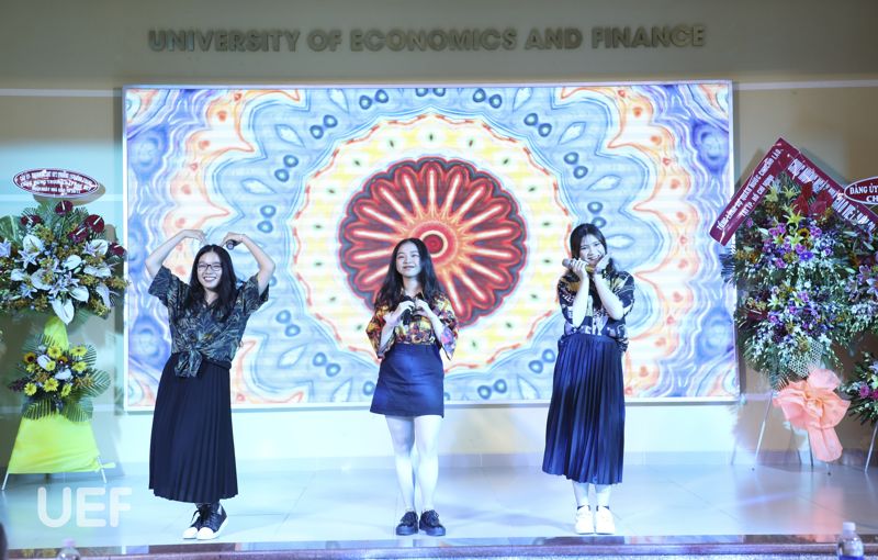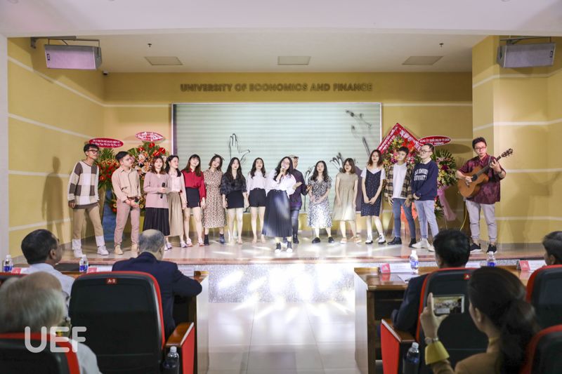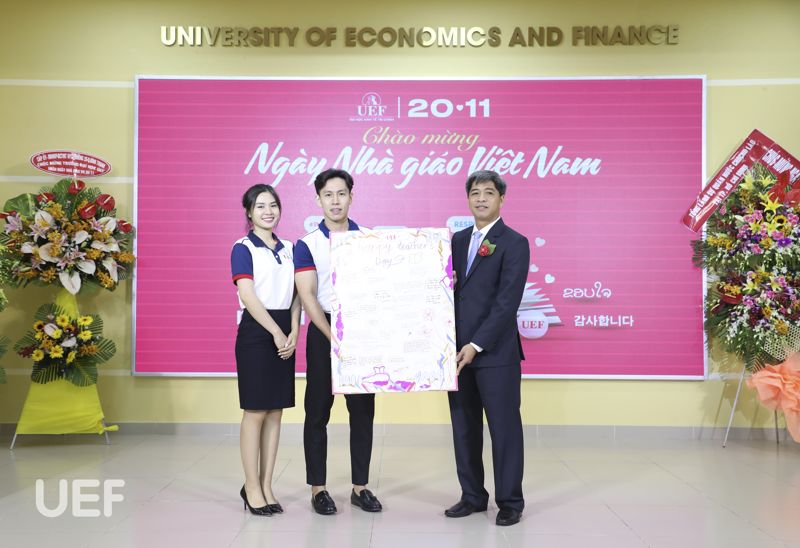 Sinh viên Nguyễn Thị Yến Nhi – Khoa Tài chính Thương mại và Trần Bảo Trung – Khoa Luật đại diện cho cộng đồng sinh viên UEF gửi tặng tập thể quý thầy cô một món quà đặc biệt