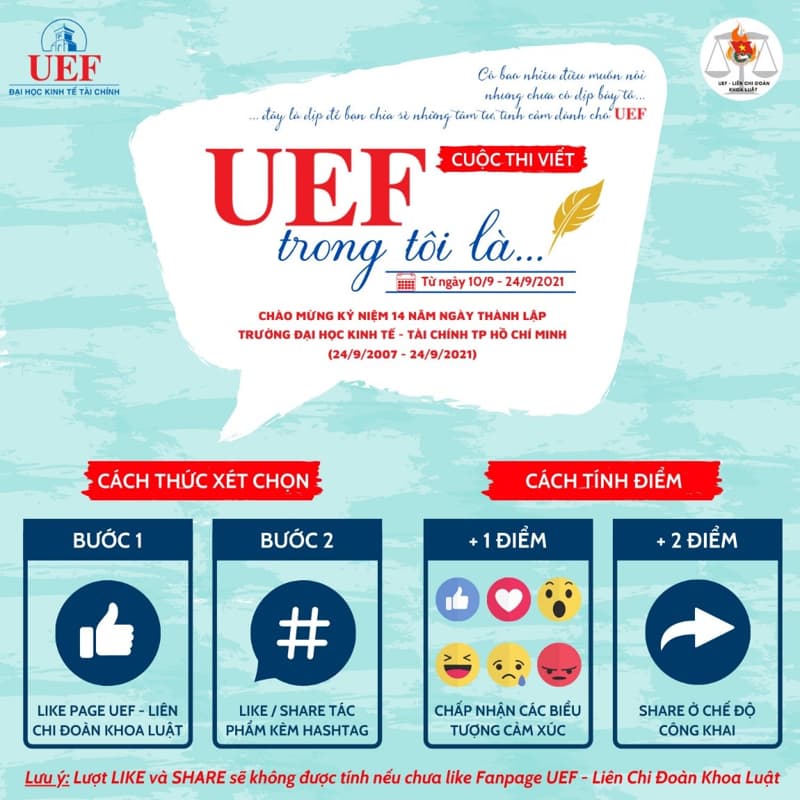 Lưu ý: Lượt like, share sẽ không được tính nếu chưa like fanpage UEF – Liên chi Đoàn khoa Luật .
