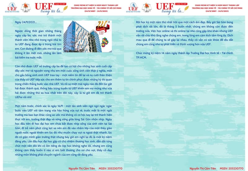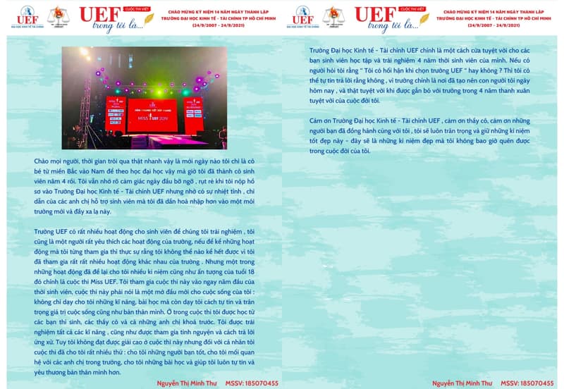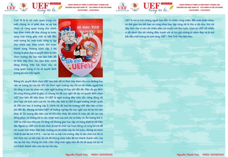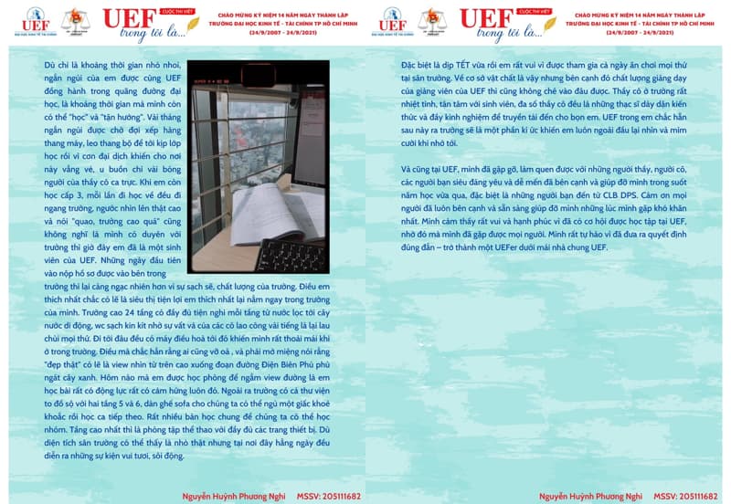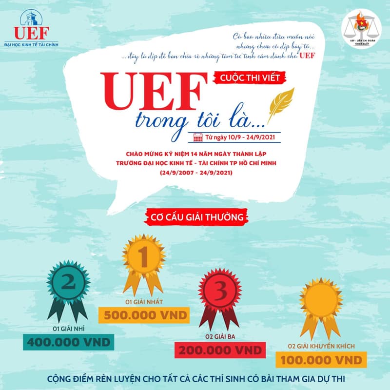 Là một trong những hoạt động nổi bật chào mừng 14 năm thành lập trường, cuộc thi “UEF trong tôi là...” do Liên chi đoàn khoa Luật tổ chức đã thu hút sự quan tâm, tham gia của đông đảo UEFers. Đây là sân chơi có ý nghĩa tinh thần cao đối với UEF khi đón tuổi mới trong thời kỳ đặc biệt.