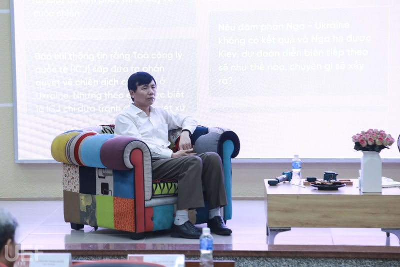 Phân tích câu chuyện Nga tấn công Ukraine, diễn giả đã dẫn ra những nguyên nhân sâu xa và trực tiếp dẫn đến cuộc xung đột quân sự này. Đồng thời, căn cứ vào tình hình bỏ phiếu của các quốc gia và những hành động của Hội đồng bảo an Liên Hợp Quốc, đại sứ đã đưa ra những kịch bản có thể xảy ra trong thời gian sắp tới: thứ nhất, Ukraine tuyên bố không gia nhập NATO, đồng ý tiếp tục đàm phán về các điều kiện khác của Nga, Nga tuyên bố chiến thắng và rút quân bộ, tiếp tục ủng hộ quân sự cho Donetsk và Luhansk, Ukraine tuyên bố chiến thắng (kịch bản này cần có sự tham gia của Mỹ, EU dưới một hình thức nào đó); thứ hai, Nga tấn công mạnh, Tổng Thống Zelensky sụp đổ, chính phủ thân Nga chấp nhận các điều kiện Nga đưa ra, Ukraine xung đột nội bộ mở rộng; thứ ba, Nga sa lầy như trước đây ở Afghanistan, chiến tranh du kích kéo dài.
