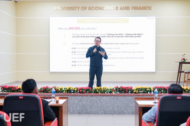 Sau khi chia sẻ những nguyên do chung dẫn đến rủi ro, khách mời cũng đã chia sẻ thêm về những tình huống có thể xảy ra ngay trong sự kiện. Những ví dụ thực tế từ diễn giả giúp sinh viên UEF có thêm những bài học mới, tích lũy được những kinh nghiệm để có thể ứng phó khi làm sự kiện sau này.